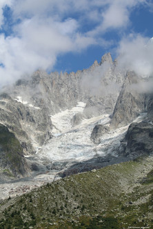 A peine sortie de la gare de Montenvers, mon regard s’est posé sur le Pic de Dru. Je le trouvais tellement beau, dégageant du respect et de la tolérance. C’est une montagne, elle en imposait, j’étais impressionnée. Je ne pouvais pas m’empêcher de prendre le Pic de Dru (alt. 3754 m) et les Grandes Jorasses en photo sous tous ses angles surtout que les nuages s’invitaient et rendaient le spectacle encore plus grandiose. Après plusieurs minutes, j’ai poursuivi mon chemin, me menant face à la Mer de Glace. Dans un premier temps, je fus très surprise, j’avais du mal à la percevoir, peut-être parce que je m’attendais à autre chose de plus vivant. C’est ici que j’ai encore plus pris conscience qu’il est important de préserver notre environnement, notre biodiversité. La Mer de Glace a déjà perdu plus de 200 mètres de hauteur soit environ 10 cm par jour lors des journées de canicule par exemple. C’est énorme et encore plus touchant pour moi qui adore les montagnes et la neige.